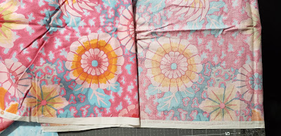 Since March, I've been searching my stash for a bolder fabric in my pink - white - blue colorway that I could fussy cut and I'd been striking out. I've been looking online and striking out too. I shopped the other vendors at the quilt show last week and nothing caught my eye. In my stash I found a leftover section of backing that is a gorgeous Kaffe Fassett print. It had a bit more orange than my original colorway but it was the best I could come up with. Plus I've got 6 months to introduce orange into the rest of my blocks to make them all look like they play well together.